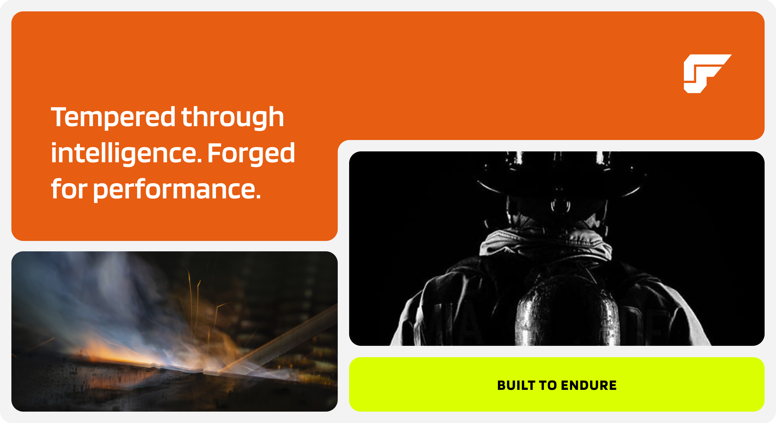 The design draws inspiration from the process of forging, where heat, pressure, and precision transform raw material into strength. We wanted the identity to feel simple yet tactical, capturing that exact moment of transformation: metal meeting hammer, sparks flying, energy in motion. The visual language reflects this tension and power through metallic gradients, dynamic lighting, and angular geometry that suggest both resilience and refinement under pressure.